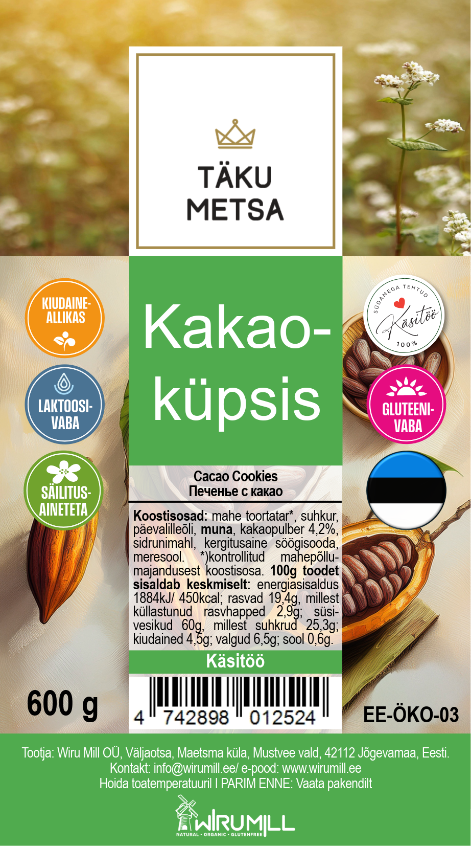 Koostisosad: mahe toortatar*, mahe suhkur*, päevalilleõli, muna, mahe kakaopulber 4,2%*, sidrunimahl, kergitusaine söögisooda, meresool.