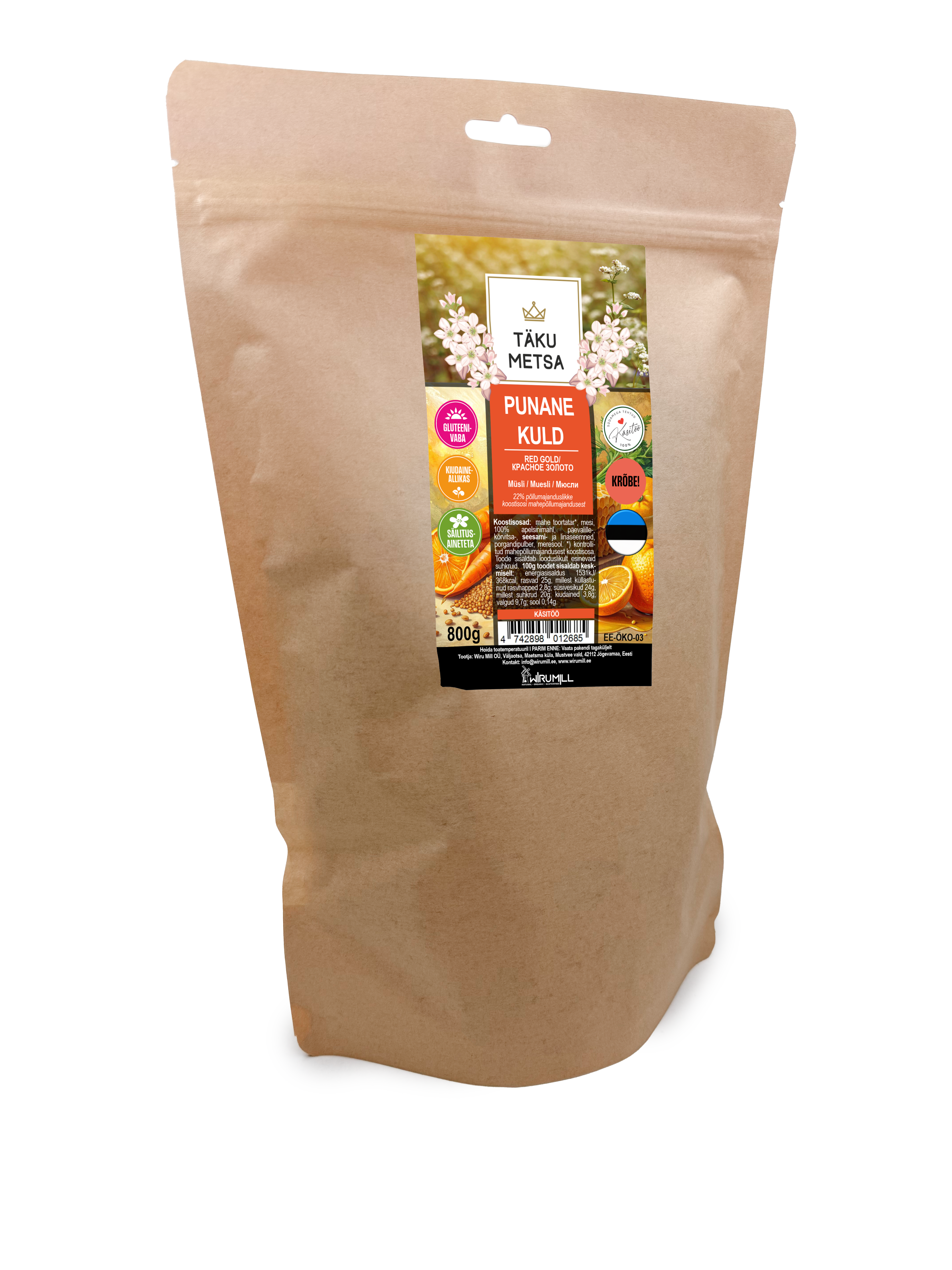 Kuldpunane, tervislik ning maitsev müsli on gluteenivaba ja säilitusaineteta, sisaldades vaid naturaalseid komponente.