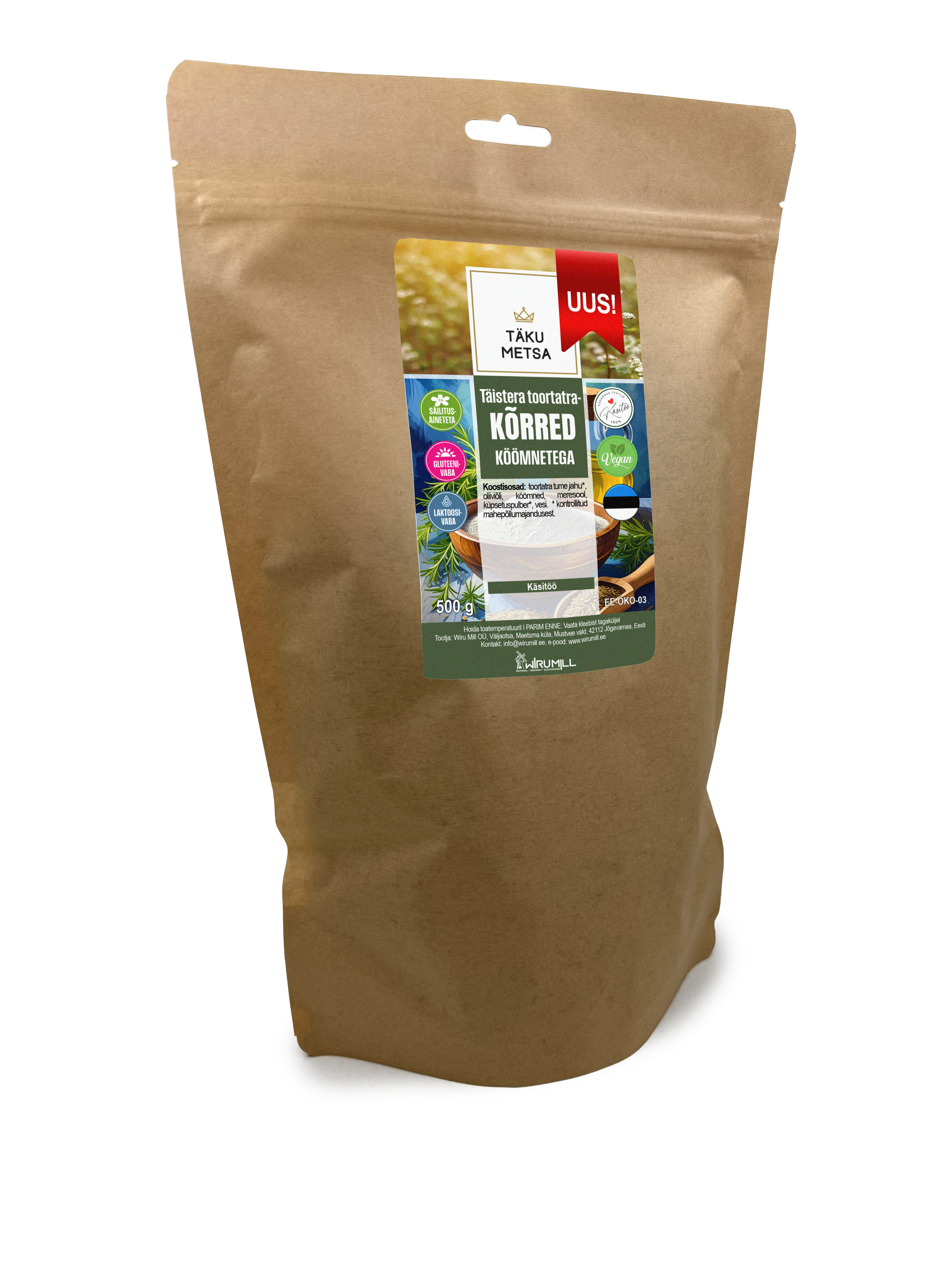 Gluteenivaba. Vegan. Säilitusaineteta. Laktoosivaba. Käsitöö. EE-ÖKO-03.