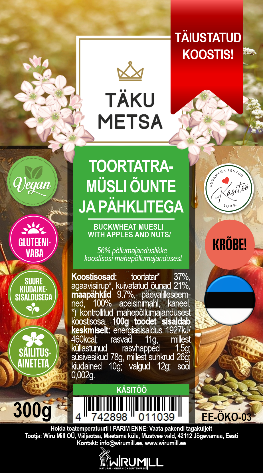 Tervislik ning maitsev müsli on gluteenivaba ja säilitusaineteta, sisaldades vaid naturaalseid komponente.