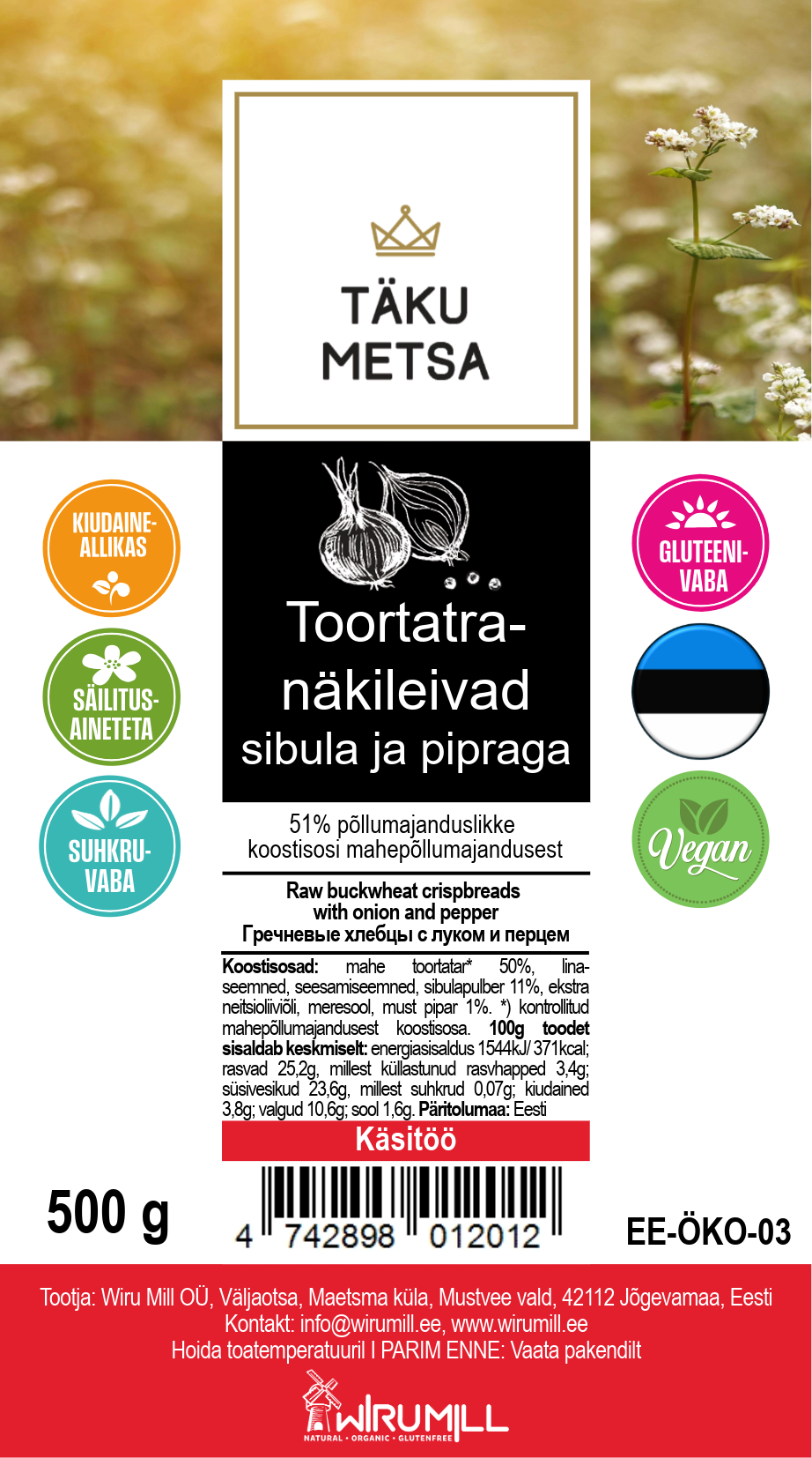 Koostisosad: mahe toortatar* 50%, linaseemned, seesamiseemned, sibulapulber 11%, ekstra neitsioliiviõli, meresool, must pipar 1%.